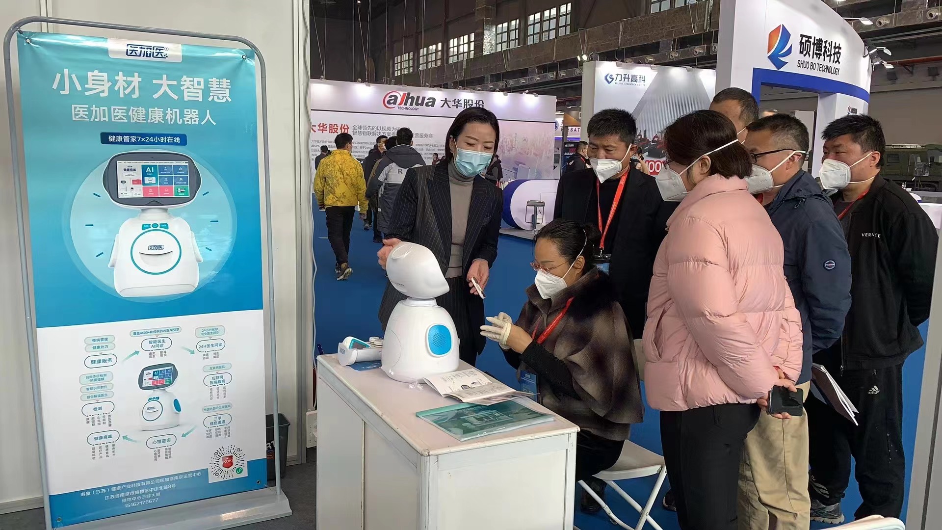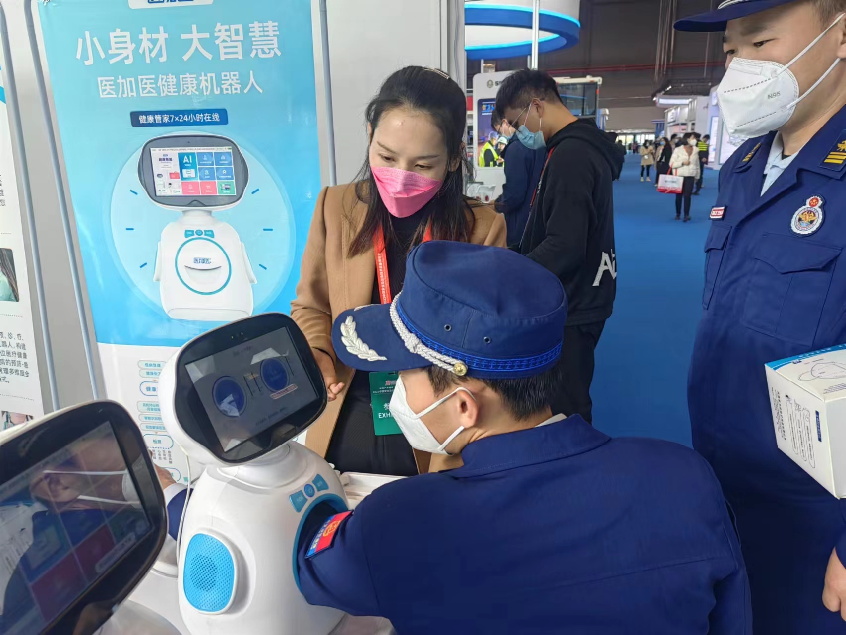 作为应急医疗参展的医加医智能机器人“考虑到孩子和老年人的使用特点,外面展示的这款医疗机器人进行了相应的人性化设计,具有AI语言识别功能。医疗或者互联网应用一般都是手机上面操作的小界面,有很多的二维码或者复杂的操作流程,而医加医健康机器人都是全程语音沟通和交流,你只要跟它讲话,它就会回应。”小身材却蕴藏大能量,医加医智能机器人,多屏互动,结合360沉浸式VR技术+远程专家实时指导,为病人神经系统的康复,提供辅助认知训练并进行智能评估,来自全国的专家远程制定个性化的慢病康复方案。